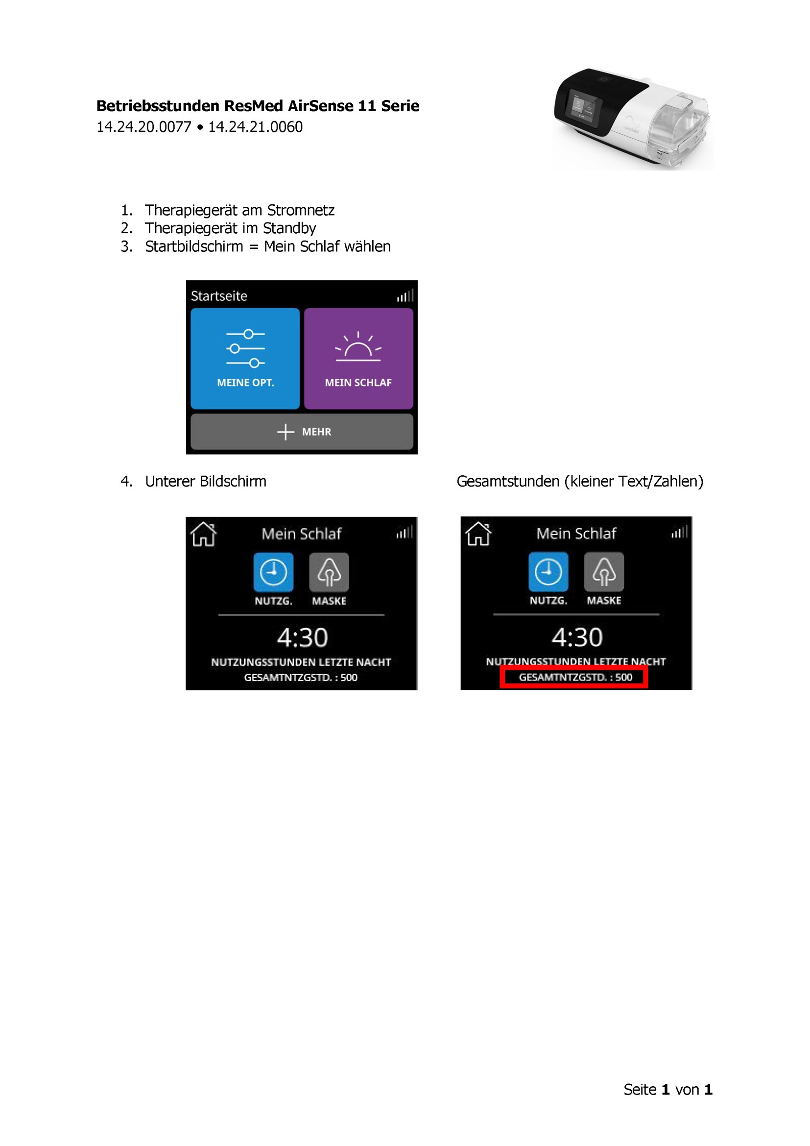 | Sonstiges | Smartstartfunktion (Startstoppautomatik), Maskenanlagefunktion (Unterstützung beim Anlegen einer Maske), Einschlaframpe einstellbar, Therapiespeicher (Datenweitergabe per Funk oder SD-Karte) |